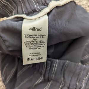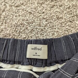 Really cute flowy double layered navy pinstripe shorts. They have a side tie, elastic waist band, small pockets and are very comfortable!