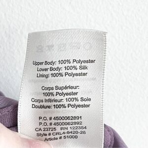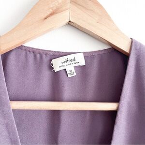 Aritzia Wilfred Silk Vignette Dress Lilac Purple Sleeveless Women's 00. Mini, above knee length. V-Neck. Perfect spring or summer wedding guest/bridesmaid dress, graduation, or cocktail/party dress! Lightweight and flowy featuring a v-neckline and curved bottom hem. The upper part of the dress in 100% polyester and the skirt is 100% silk with a polyester lining. The dress also has pockets and a side zipper for easy on and off. Very good used condition-the tag is only attached on one side. Please see photos for approximate measurements.