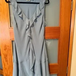 Chic soft blue top with ruffle accents. Ideal for versatile styling.