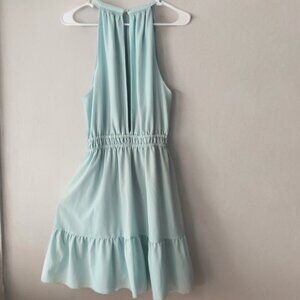 High neck sleeveless mini dress with smocked waist and ruffle hem