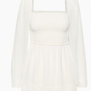 This is a tiered mini dress with a smocked bodice, square neckline and voluminous sleeves. It’s made with Fête Chiffon™ — lightweight, semi-sheer fabric with an ethereal drape.