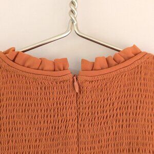 This is a smocked blouse with ruffled edges and voluminous puff sleeves. It’s made with Fête Chiffon — lightweight, semi-sheer fabric with an ethereal drape.