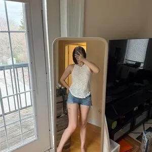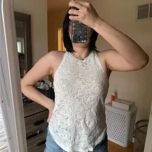Sleeveless racerback tank with delicate lace-like overlay. Lightweight knit that layers easily. Cream white hue pairs with many outfits.