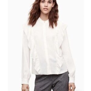 Aritzia Wilfred Panthere Ruffled Longsleeve Blouse in white. Made from 100% cotton, this mandarin collar blouse with ruffled details will elevate any outfit.