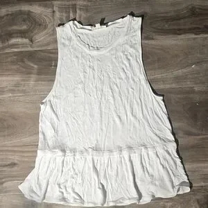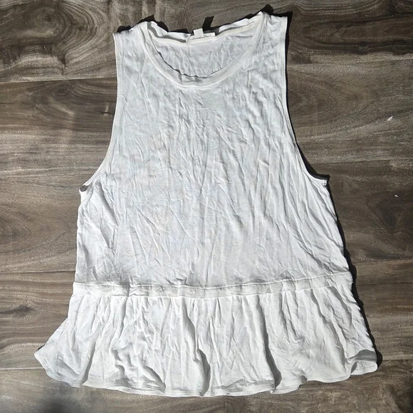 Chic white tank with ruffle hem. Sleeveless and stylish. Perfect for layering or solo wear.