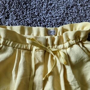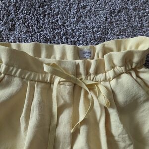 High waisted paper bag style cinched waist short. They have a clasp and zipper closure along with a drawstring waistband, and pockets.