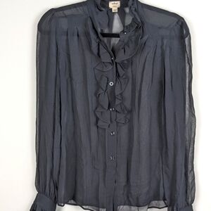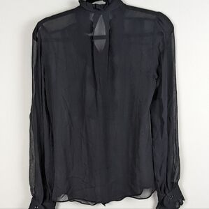 A gorgeous sheer black top by Wilfred 100% silk material features ruffles down the buttons and ruffles on the sleeves as well as pleated detail down the top Very excellent condition this is sheer and does not contain any lining comes from a smoke-free pet-free home length 25" pit to pit 18"