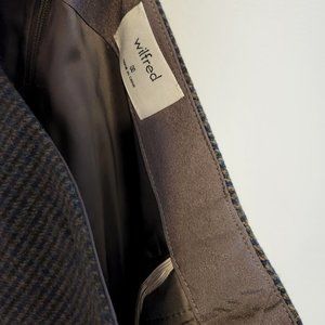 Aritzia. Subtle colours, wool with lining, and has pockets. Back zip closure. Worn once. Size 00. Blue, brown and grey. It's cute and flattering but I'm certain my butt no longer fits in this size.