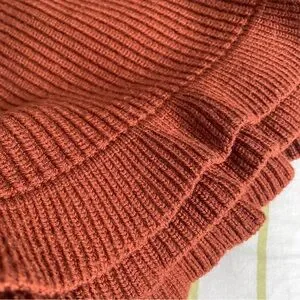 Elegant sweater with ribbed texture. Crew neck, Slightly cropped length with ruffles detailing. Beautiful rust/dark caramel colour. Super soft and warm and cold days.
