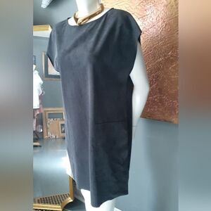 adorable amd minimalistic faux suede mini dress from Wilfred Free. excellent condition. no flaws to note. deep slate grey in colour with raw edge hems. side pockets, short sleeves with a boat neck. pull over style. loose fitting and oversized. see pics for material composition! size medium. see flat lay measurements below!