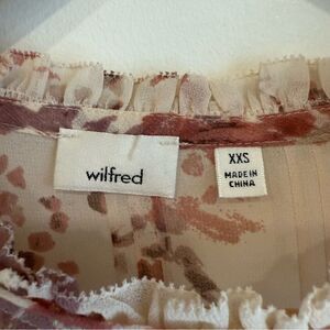 In very good condition. Wilfred Lourdes long sleeve blouse. In a pretty two tone pink floral patter with a high neck and ruffled trim. This one is missing two buttons, but one is attached to the care tag inside. This elegant floral print top with a blend of pink and cream hues is perfect for work or any occasion when we want a feminine look. This top gives you a relaxed, flowy fit. Flat lay measurements: 20" pit to pit, 21"length