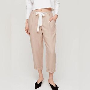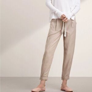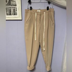 These are casual trousers with a drawcord waist and rolled cuff hem. They’re made with a lightweight, drapey crepe fabric from Japan. In Euc. Size 4 fits 4 smaller 6. Retail for $138.