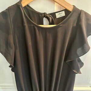 Black jumpsuit with elasticized waist, slightly open slit back that ties at the neck, and scalloped sleeves.