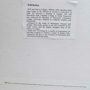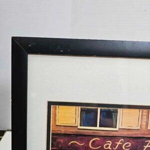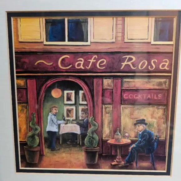 This framed print by Will Rafuse captures a charming scene of 'Cafe Rosa' and is in used condition. The artwork is visually appealing and could make a lovely addition to any room. There are some minor scuffs on the frame itself, but the print presents wonderfully. I think it is lovely but doesn't quite match my current aesthetic, so I am hoping to find a new home for this beautiful piece. It's ready to hang and enjoy!