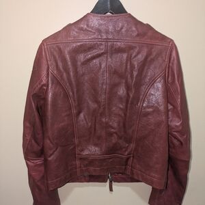 Stylish deep red leather jacket with a sleek design. Features zippered pockets and a modern cut.