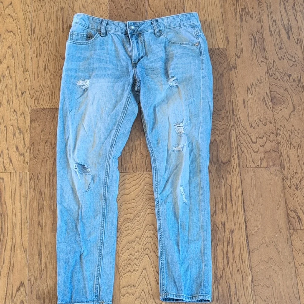 Stylish and comfortable boyfriend style, these light blue distressed jeans are perfect for a casual look. Crafted with quality materials for durability.