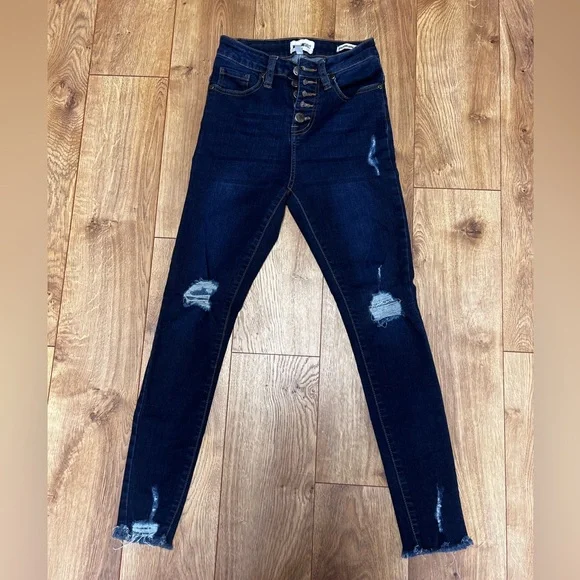 William Rast distressed dark jeans. Size 24. High rise, skinny leg, raw hem. Wear with heels & a blazer or a t-shirt and sandals. Very versatile jeans. Super soft. Excellent condition. These jeans are waiting to be worn by you.