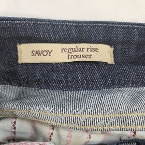 Stylish dark blue jeans with straight leg design. Features signature back pocket stitching. Ideal for versatile wear. Length 28" Rise 7" Waist 23"