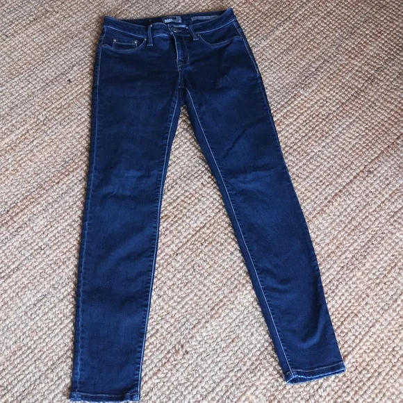 Dark wash William Rast 'mid-rise slim leg' jeans. Great jeans: I bought them, put them on - they fit amazingly! - and then realized the front pockets are fakers! I mean, I guess that helps with the slim, streamlined look, but I'm lost without front pockets. If you can live with this quirk, these are fantastic jeans. Size 4; measurements in photos.