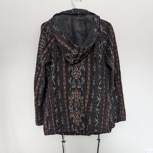 Great Utility Jacket with drawstrings at the waist and bottom, multiple pockets, a hood that can be zipped into the collar, and option to wear with sleeves rolled as shown. Print is charcoal (almost navy), warm gray, and rust.