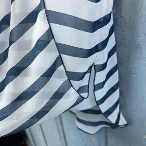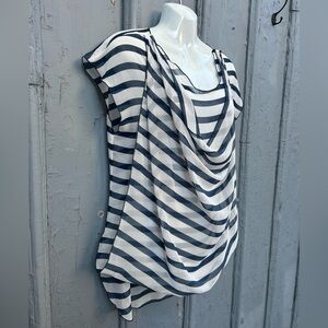 Beautifully draped sheer sleeveless striped blouse. Designed and made in Canada by small boutique designer Willowmore. 2 layers of sheer striped material in the front give a beautifully elegant look.