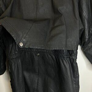 Wilson women’s black leather anorak jacket, size L, in gently used vintage condition. Made from heavy, quality leather with a stylish Matrix-inspired back flap that snaps open and closed. Functional and fashion-forward, this coat is built for both utility and drama.