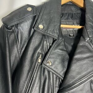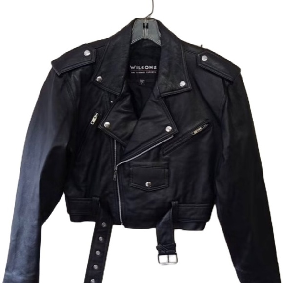 The Wilson Black Leather Motorcycle Jacket is a stylish and durable choice for any wardrobe. Made from high-quality leather, it features a sleek, glossy finish and a wide notched lapel collar. The asymmetrical front zipper and silver-toned hardware add a touch of edgy sophistication.