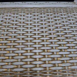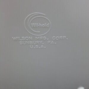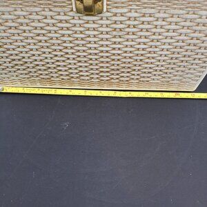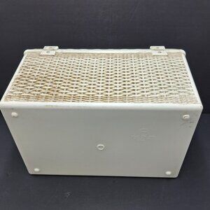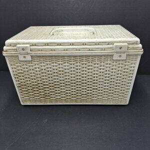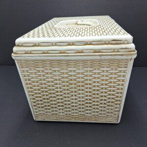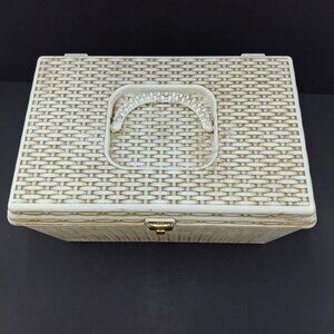 The Wilson WIL-HOLD Gold White Plastic Wicker Basket Weave Sewing Box is a vintage storage container for sewing and crafting supplies, manufactured by Wilson Manufacturing Corp. in the United States. It's a popular and enduring design, often found as a collectible item today.