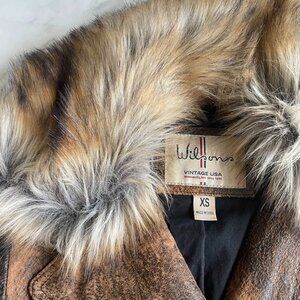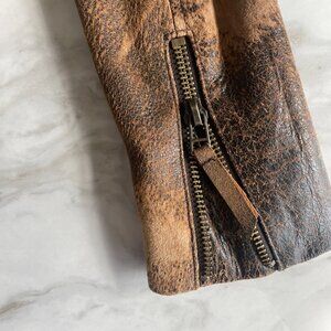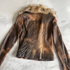 Super stylish distressed tan color leather jacket with a removable faux fur collar.
