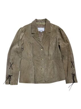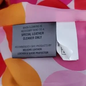 Vibrant pink leather jacket by Wilsons Leather. Features colorful lining.