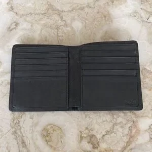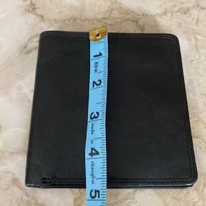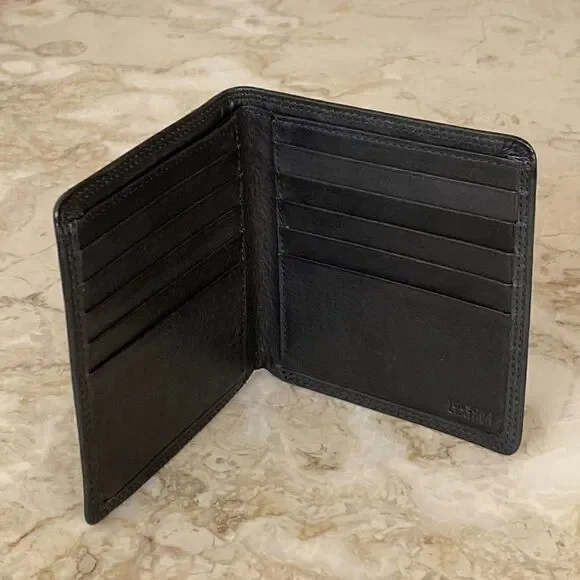 In excellent preowned condition classic Wilsons black leather bifold wallet. Has 5 credit card slots, 2 horizontal slip pockets and two full length slip pockets for bills. Simple, classic and elegant wallet.