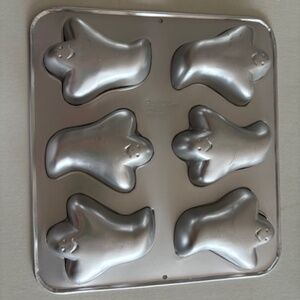 Boo! Six-cavity design lets you bake six (6) ghosts! The finished product measures approximately 4.0 -inches wide by 5-inches tall, at the widest points. This is an older, all-aluminium, baking pan by Wilton. Very good condition, as it was only used once.