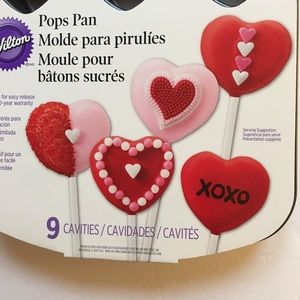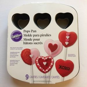 Share your valentine love with home-baked goodies Wilton Pops Pan - unused, in original packaging Makes 9 pops - each approximately 2” x 2” Non-stick for easy release; use & care instructions on back of package. NB - Warranty is not applicable. Dishwasher safe