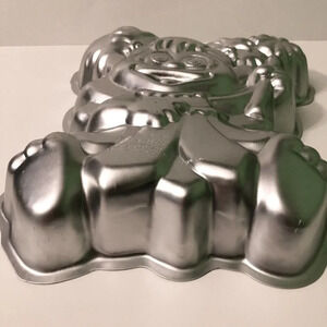 This cake pan is pre-owned and in used condition. They are scratches and marks on it. The instruction paper has some stains. Please see all photos for exact item.