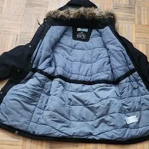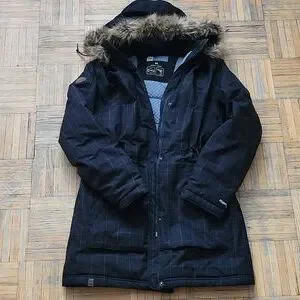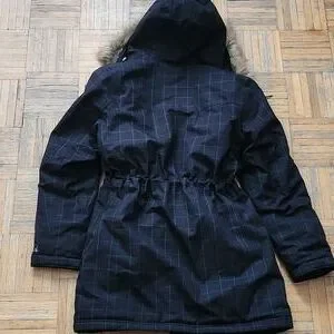 Please excuse my floors. I am too spent to lay a blanket down. They are clean but crappy. Excellent condition just need a clean. Sinchable waist and fur trim on the hood is detachable. Lined with fleece on the torso. Downsizing my everything right now so my purge is your gain🤓