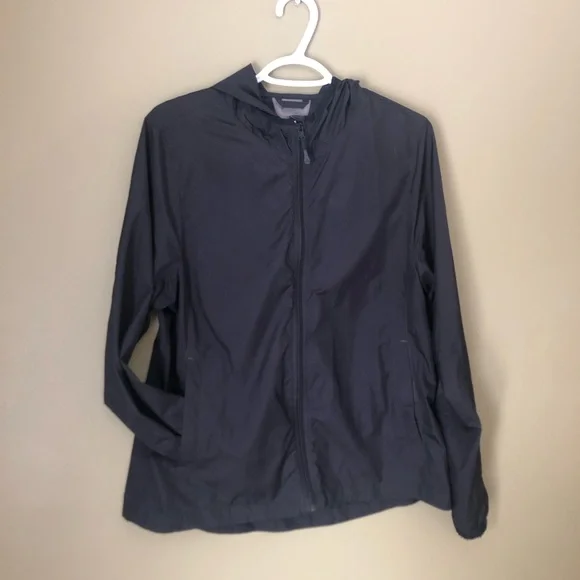 Size large. Black. Lightweight spring jacket. Pockets & hood.