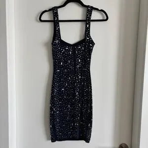 You'll be serving glitz and glamour all night in this iconic rhinestone bodycon mini dress! The airy sheer mesh fabric is accented with all-over rhinestone embellishments for a luxe shine, and includes a full-length knit lining for coverage. The mini-length dress features a sleeveless square neckline, thin tank shoulder straps, a secure back zipper closure, and a bodycon silhouette to flaunt your stunning curves. Style with metallic heels.