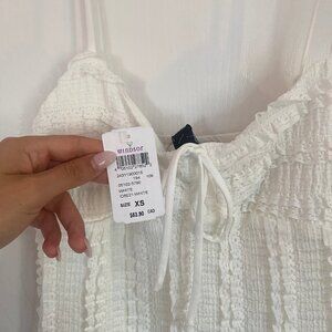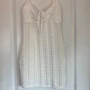 Adorable white mini dress with a feminine bow tie detail and textured fabric🤍