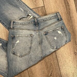 Create a dramatic moment with distressed jeans that add an edge to your look! The medium-wash denim jeans feature a flattering high-rise waist and a boyfriend silhouette with trendy knee slits. Complete the look with a crop top and combat boots.
