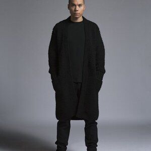 Wings + Horns blazes up the cardigan with a frock coat length and a slim fit. Each one is handmade in Canada from 100% Peruvian wool. It has gusseted underarms, articulated sleeves and a pair of welt pockets.