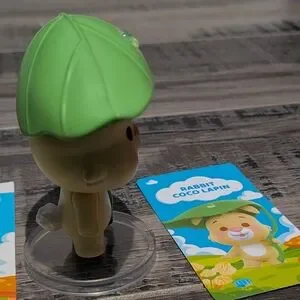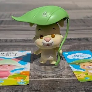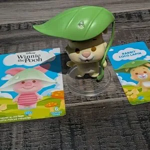 Winnie the Pooh miniso blind box, rabbit figurine holding a green leaf umbrella. This figure is brand new and kept in a bag as he was a double from a mystery box. The leaf disassembles as well as the stand.