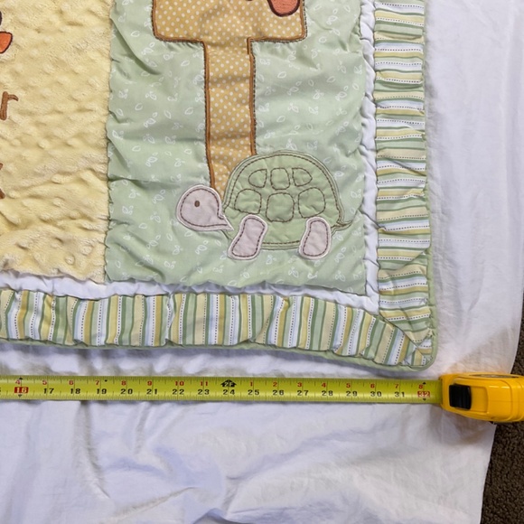 This crib blanket is in excellent, clean condition, but there are three marks on the back: a slight stain at the bottom edge, and what looks like a Sharpie mark (have washed and stain-treated and this didn’t even lighten up), as well as another very minor Sharpie mark at the top. There are no marks on the front. This is a soft, cuddly blanket.
