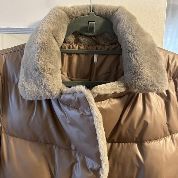Camel puffer Coat, long as just under knees, with top up zip. Nearly new, cutted logo. A bright color in the winter. With enclosed artificial fur collar. Size in small.