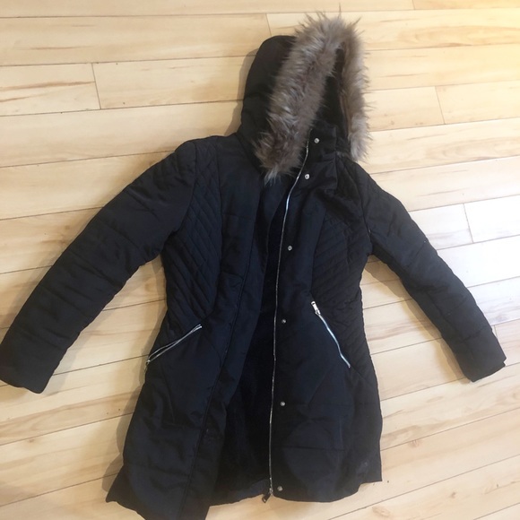 Black winter coat with soft fur inside. Very warm. Faux fur.