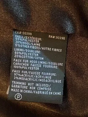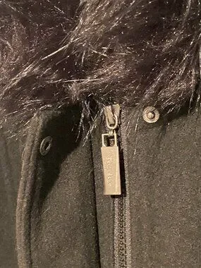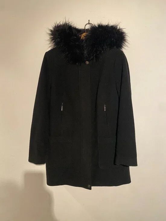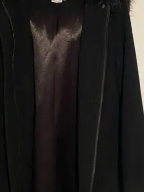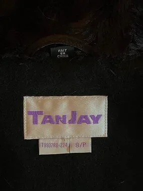 This ladies Tanjay black 3/4 coat has a non-removable hood that is trimmed with faux fur. There is a front zipper closure along with one button snap at the top, to secure the coat. Two zipper pockets are located directly on the front of the jacket. The garment is hand or machine washable. The jacket is in excellent condition, hardly worn.