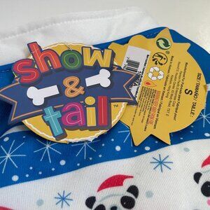 Adorable fleece-lined winter dog coat featuring skiing pandas in festive scarves