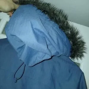 Nice blue colour. Detachable hood. Lightweight but warm. Good length for coverage.