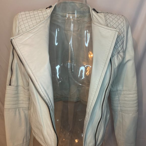 On-trend winter white moto-style lambs leather jacket by Guess.