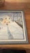 Beautiful winter landscape painting with a snow-covered house. Framed in a blue/silver frame.