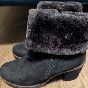 Navy blue with faux fur. Side zip. Gray rubber sole. Navy blue suede heel. Size 9. Sole length: 28 cm x 8.5 cm wide. Heel: 7 cm. Total height: 22 cm. Silver interior. Like new